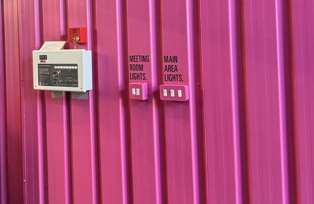 ショールームへ上がる階段があり、下のフロアはショールーム兼ミーティングルームのような構成に。どちらかというとB2B向けの展示什器などが置かれていて、実際にビジネスミーティングができるスペースになっています。