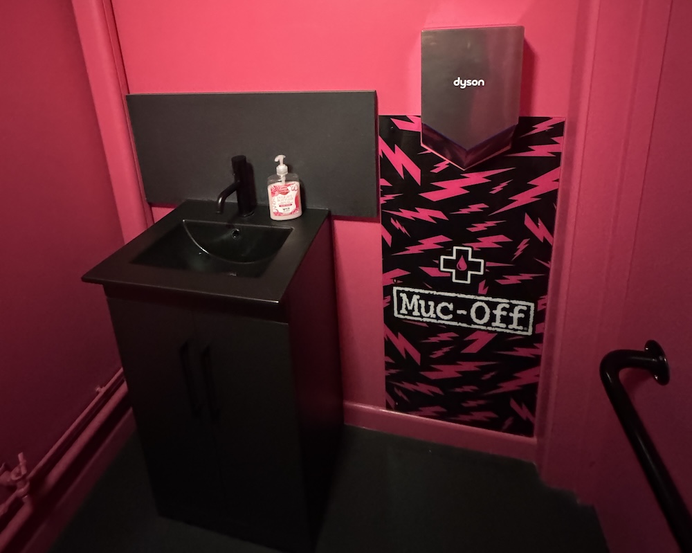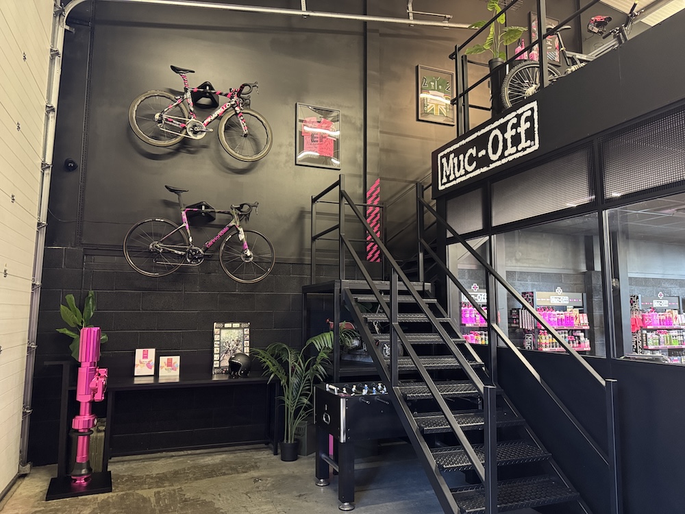 階段の横には、MUC-OFFのグラフィックが入ったバイクが展示されていました。