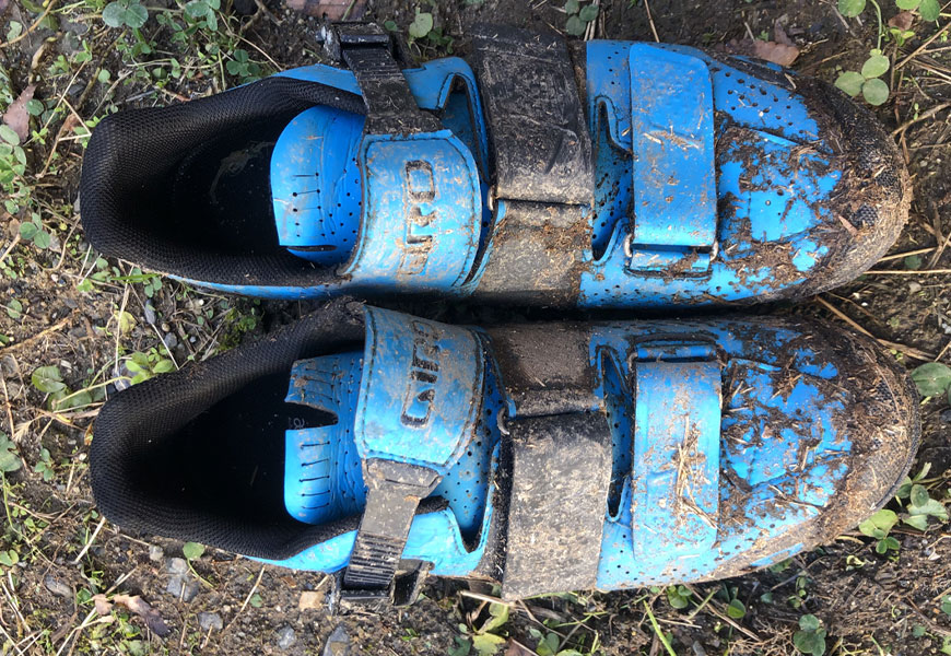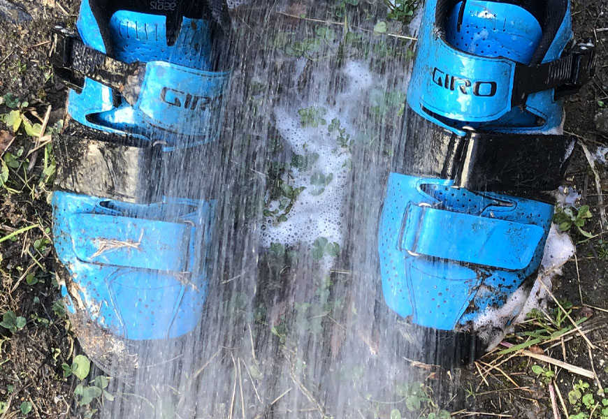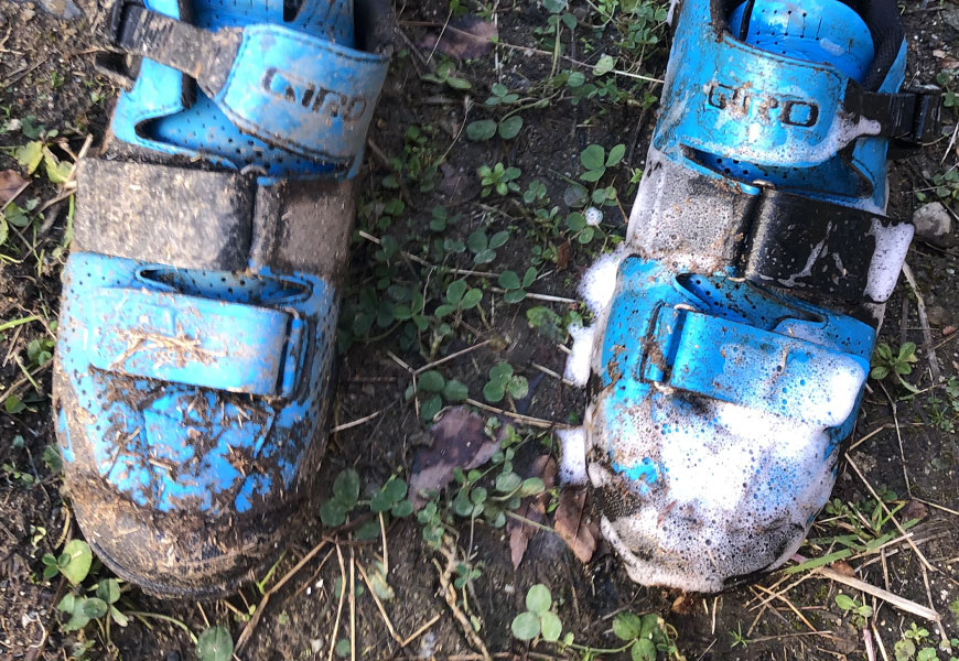 ご覧の通り、ナノテックを吹きかけたシューズのほうが表面にへばりついた泥をよく落としてくれています。
