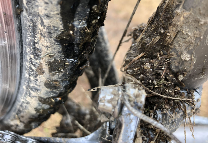 タイヤのブロックの泥詰まりは硬めのブラシで…