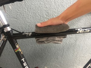 まずはフレームから、一番目立つトップチューブ、ダウンチューブシートチューブをとりあえず拭いて