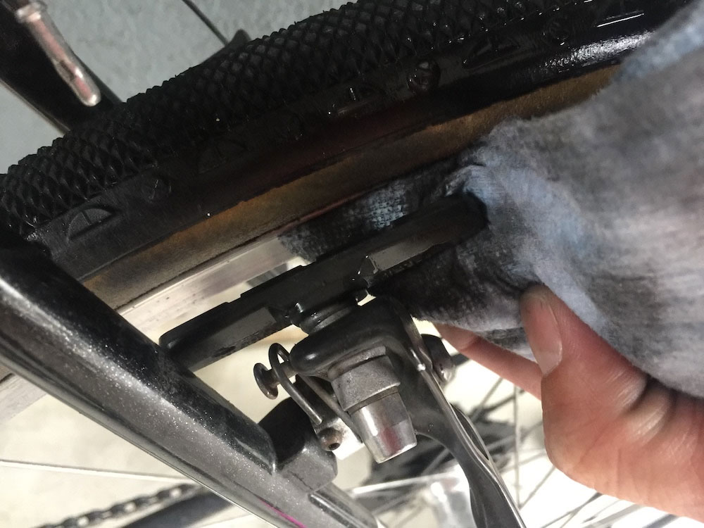リムと同様、ブレーキシューのカスがつきやすいところは、やりがいスポット。