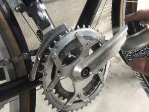 ボルトや、ディレーラー周りの可動部もぶしゃっと吹きかけて拭いておきます。
