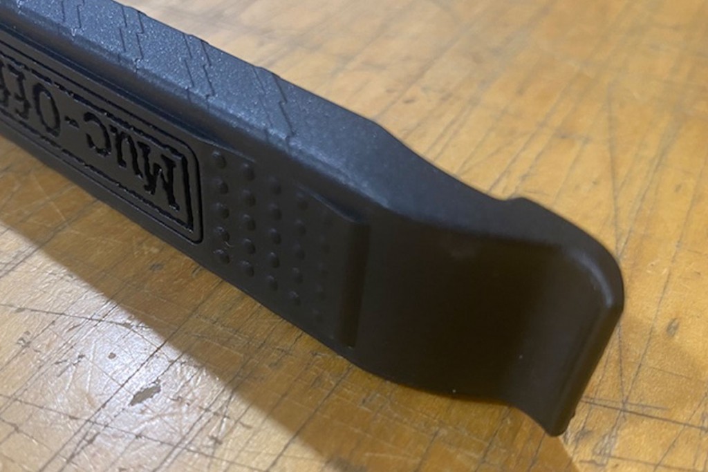 それに対してMUC OFFは、逆向きにツメがついており、先にビードにレバーのフックを引っ掛けたら、ここではまだツメは引っかからず、スプーンのようなくぼみにそって滑りながら、支点をずらしてビードを外に連れていきます。