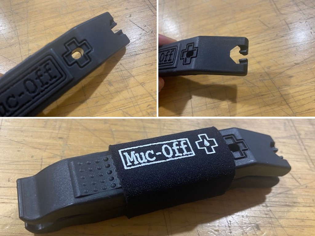 力が入れやすいよう、サイドの滑り止めもMUC-OFFの稲妻マークになっていたり、親指のところは、滑り止め+くぼみの加工