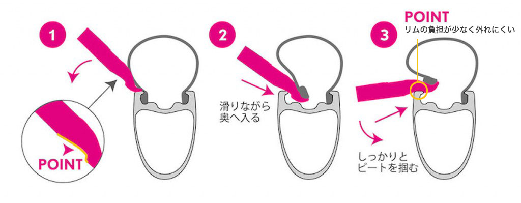 細いロードリムなら従来のタイヤレバーの方がコンパクトで早いです。