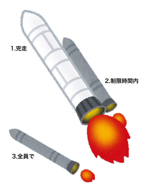 1.完走 2.制限時間内 (3.全員で)みんなきつい、でも私だってきつい。