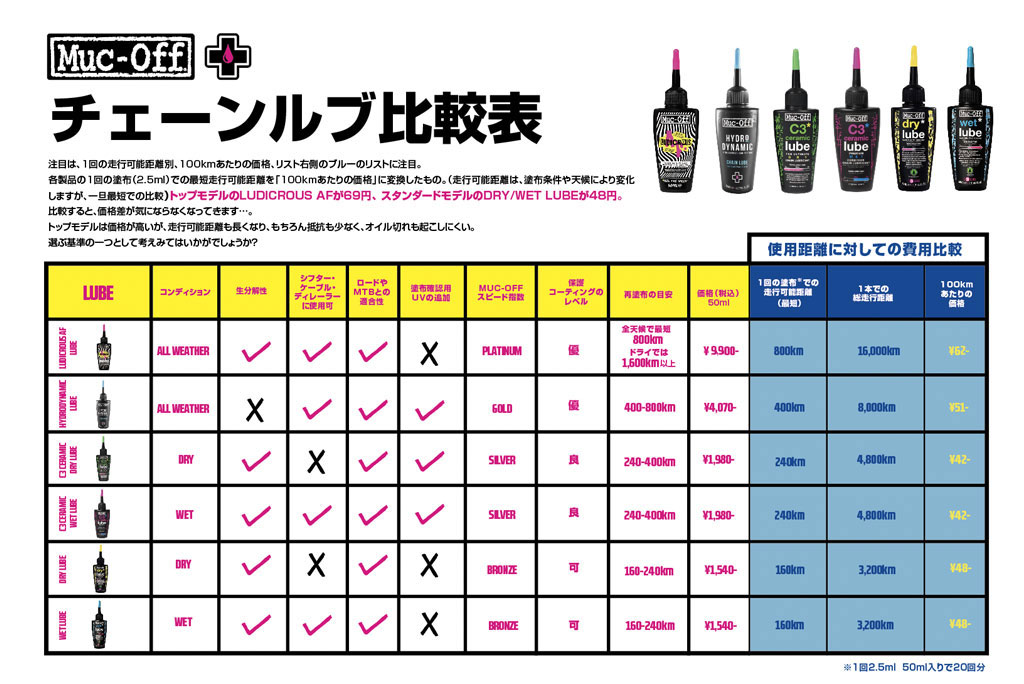 Muc-offは現在6種類(E-BIKEラインナップ除く)のチェーンルブをラインナップしています。