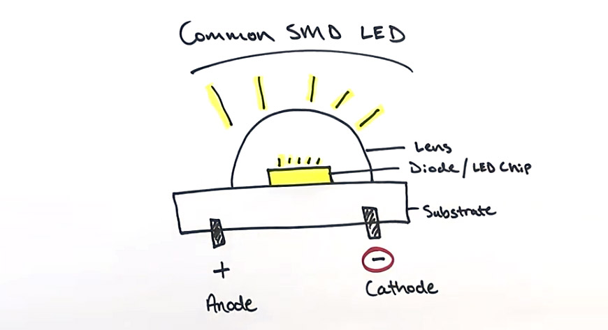 SMD LEDは、1つの基板に1つのLED(と電極)を実装した構造。