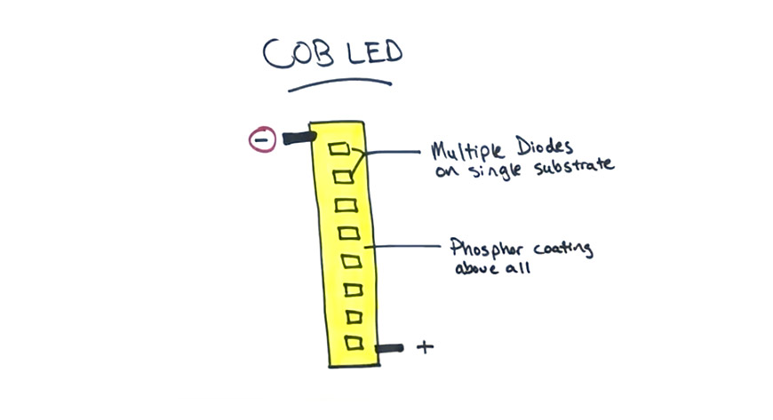 COBは、1つの基板上に多数のLEDチップを高密度に配置し、発光面全体が光るのが特徴。