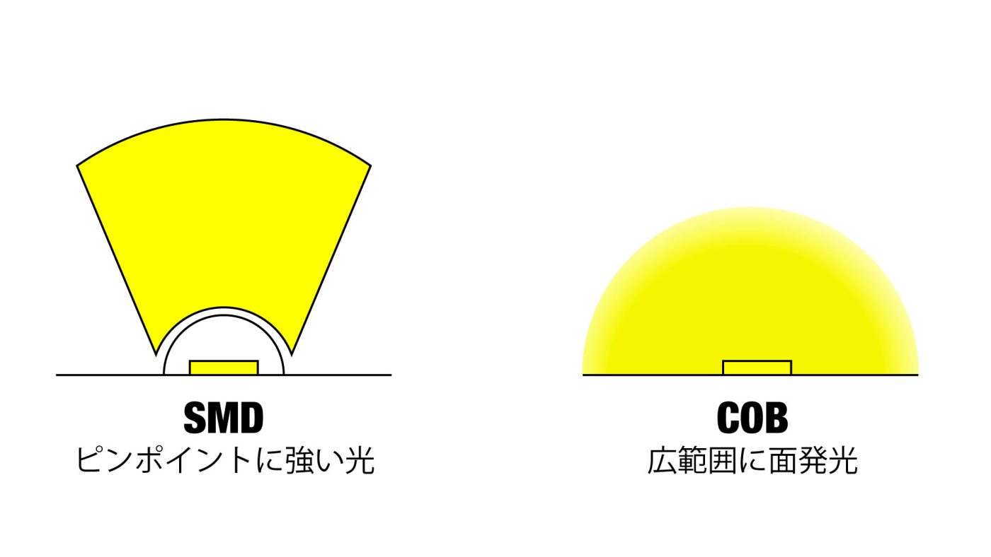 歩行者や車などあらゆる方向からの視認性を高める目的であれば、COBタイプのLEDの方が向いていると言えます。