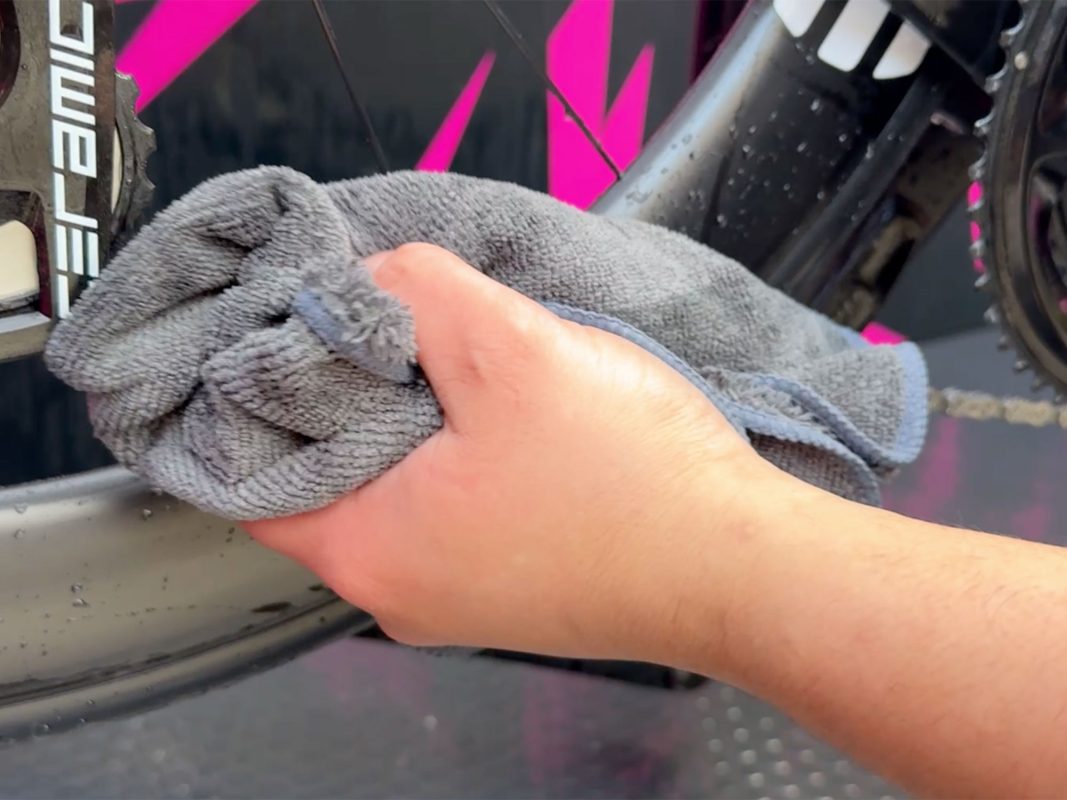 1.洗浄後、タオルでチェーン全体の水気を拭き取る