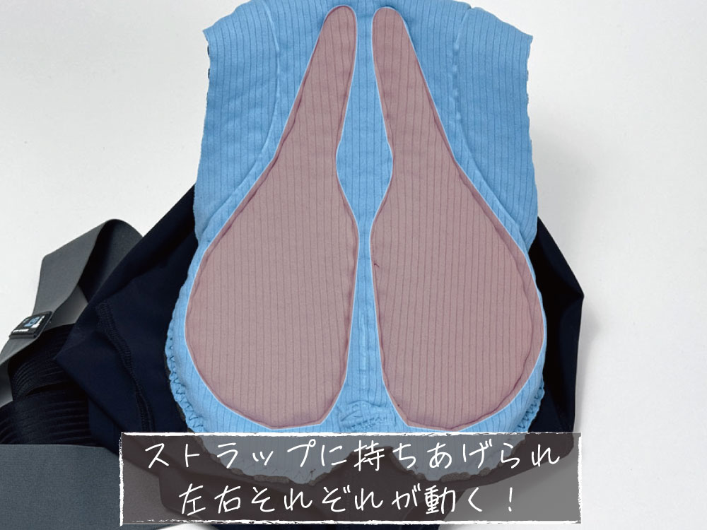 パッドを裏返してみてみると、左右でパッドが分かれているため穴あきサドルのような構造で尿道の圧迫を防いでくれます。