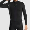 ASSOSのウィンタージャケットと同じ考えで作られた「ウィンタースキンレイヤーP1」は、襟がより高くなり首元の保温性が高まりました。以前と同じシームレス構造ですが、生地の表面は密度が濃く保温性が高く、熱のこもりやすい背中や脇周りなどは少し大きいメッシュとなり上がり過ぎた体温を放出します。