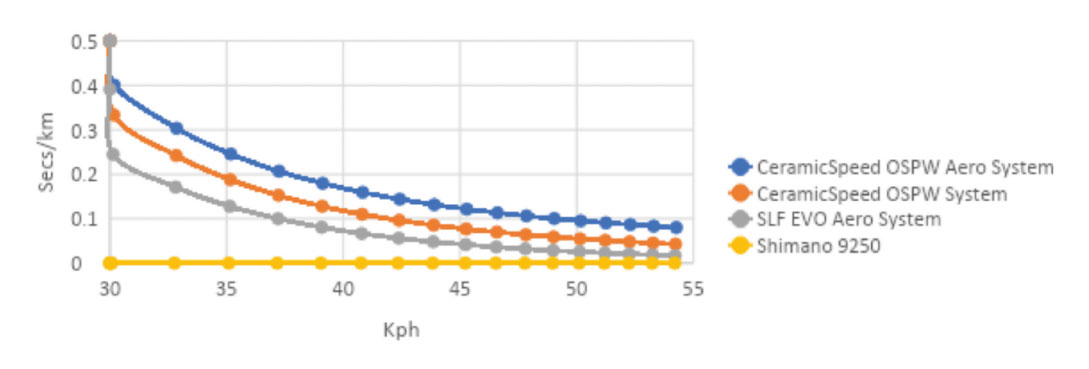 速度が低い場合より大きな違いを生み出し、30~35km/hあたりでは1kmあたり0.3秒近く短縮することが可能です。