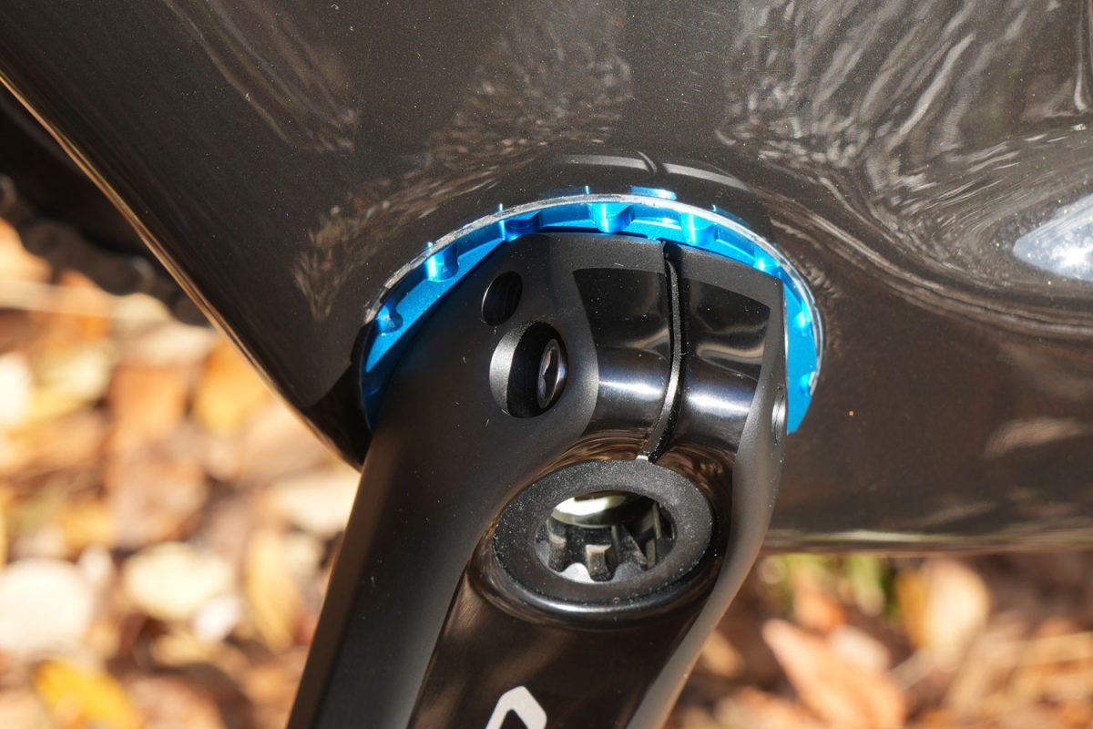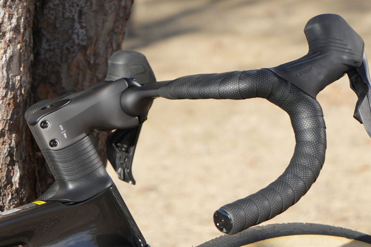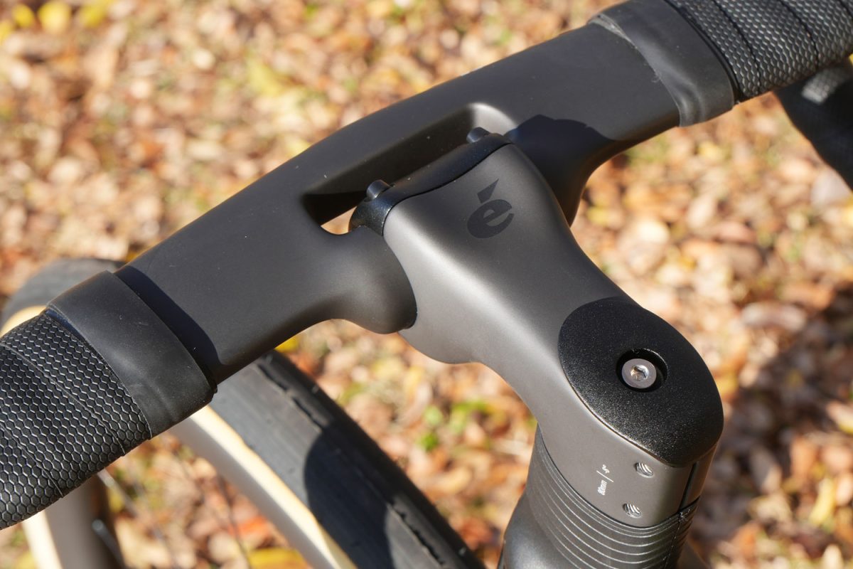 ケーブル類をフル内蔵した専用コックピット。高速域での巡航性能は、純粋なロードバイクに迫ります。あえて2ピースハンドルにすることで、セッティングの幅を持たせています。
