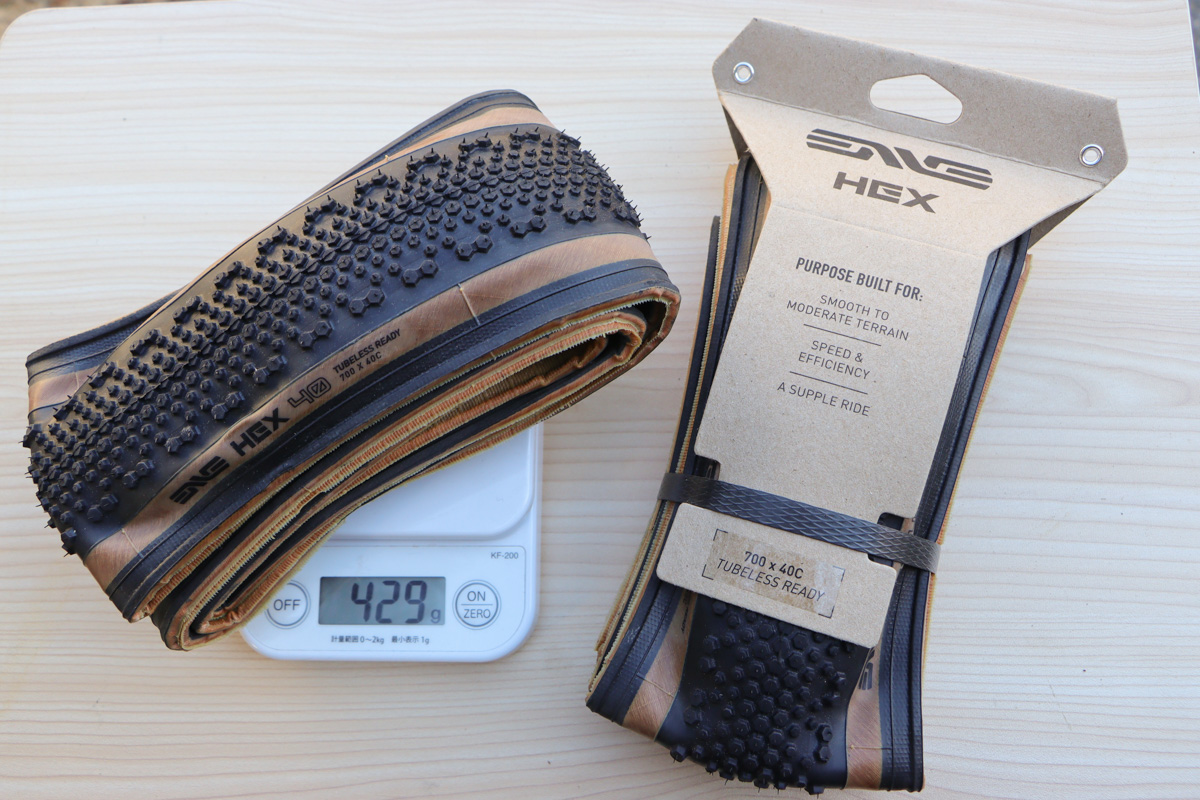 全面に六角形のノブが配置されたENVE HEXは、40Cと細身で軽く、ちょっと自分の好みとは違うタイヤだった。しかし使ってみると目から鱗の良さだったので、タイヤも含めてレポートしよう。