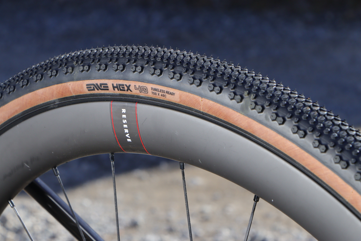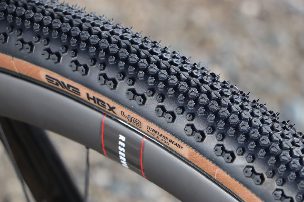 HEXはENVEの開発陣がレースをターゲットにつくったグラベルタイヤという触れ込み。40Cで430gと軽量で、トレッドの下部にはパンク防止バリアが埋め込まれているのがわかる。ビード部には帯状の緩衝材「チェーファー」が備わっていて、リム打ちパンクを防ぐ構造になっている。