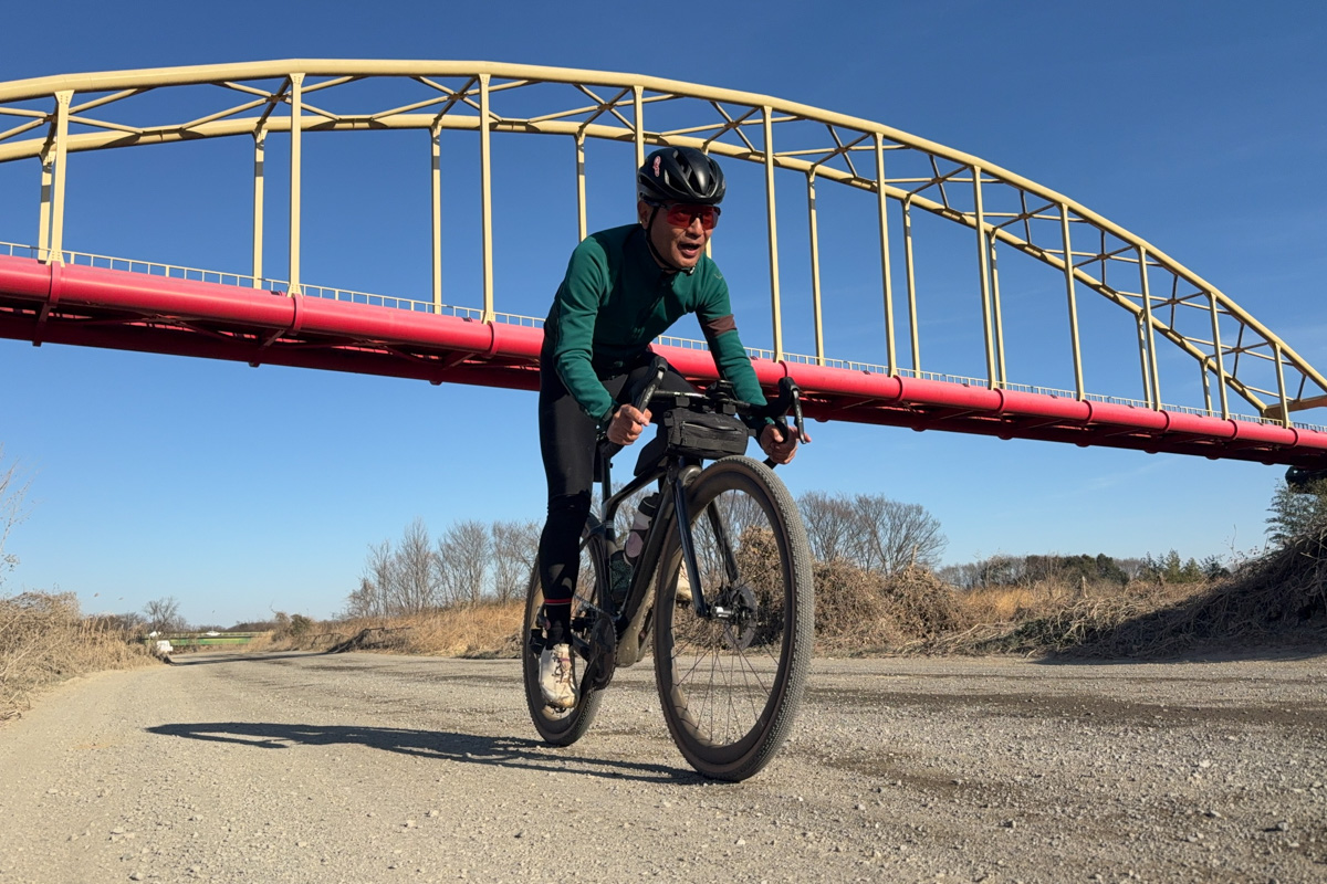 まずはフラットダートへ。関東圏なら荒川や入間川沿いの河川敷の良く締まった砂利のグラベルは北米のアンバウンドグラベルのルートに似ている。ドライな日であれば走行感も軽く、ハイスピードで走り続けることができる。