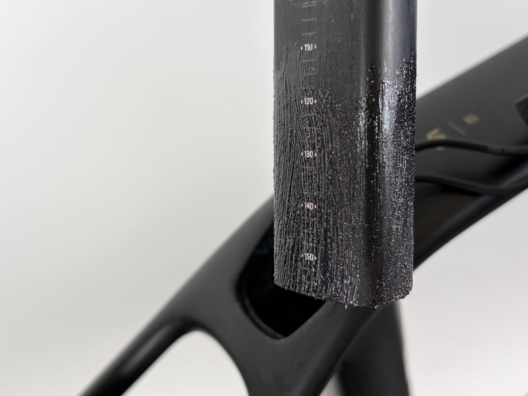フレームのシートポスト差し込み口も同様に脱脂します。砂や汚れをフレーム内におしこまないようよう、外へ「掻き出す」ように慎重に清掃してください。