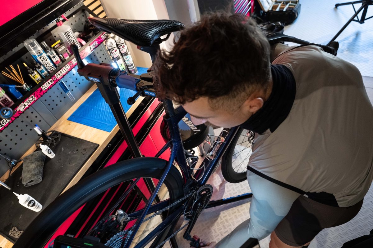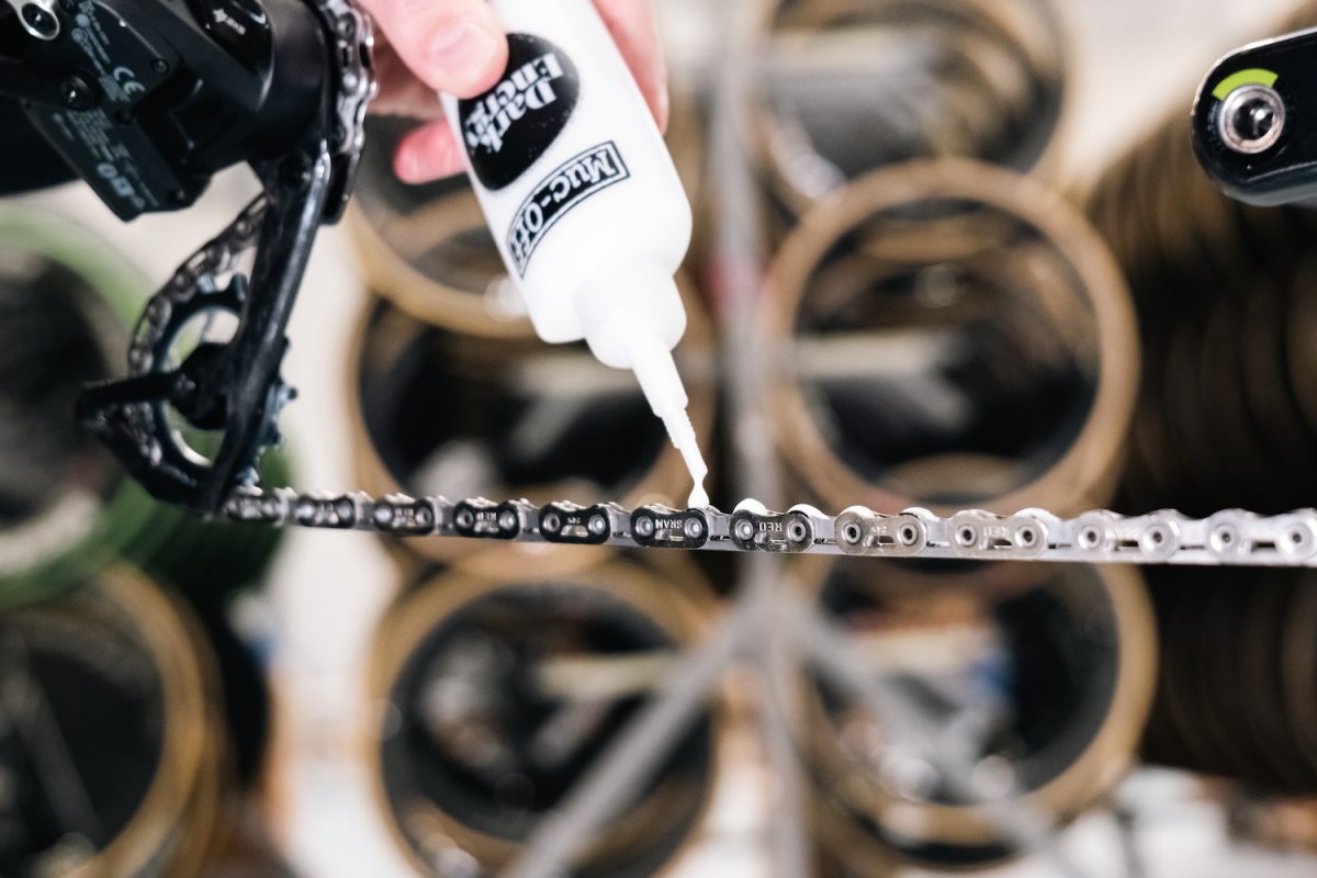 自転車をスタンドにセットし、各リンクのローラーに1滴ずつ垂らします。クイックリンクから始めて1周、さらにもう1周(計2周)行います。