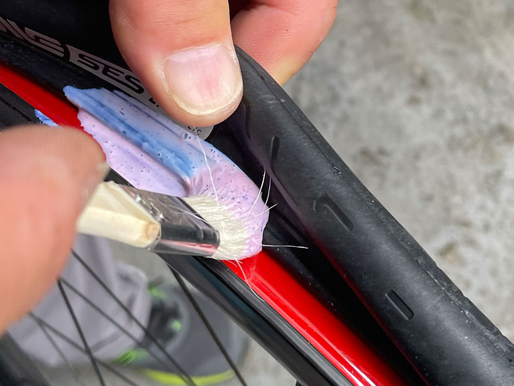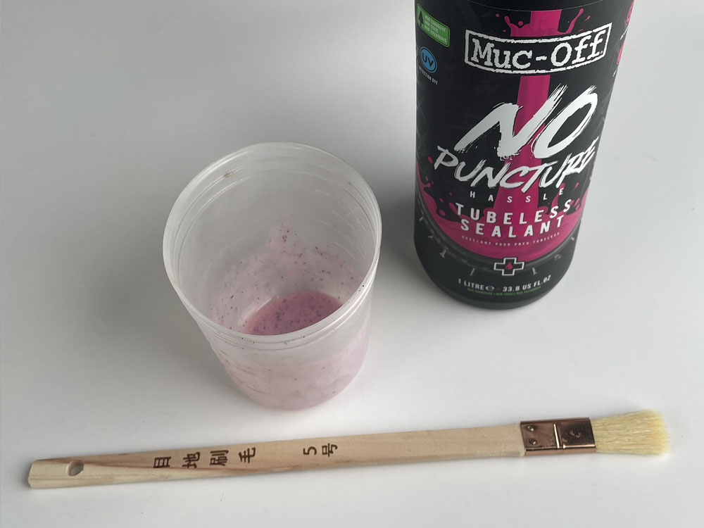 - タイヤをリムの内側に落とした後、シーラントをハケでタイヤビードに塗布