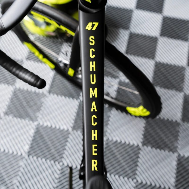 またサーキットを出ればシューマッハはサイクリストであり、No.47カーの塗装にインスパイアされたカスタムペイントのMeleeにも乗ります。