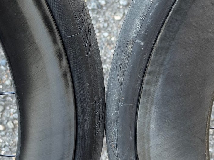 左: 内幅25mmに28Cのタイヤ / 右: 内幅23mmに30Cのタイヤ