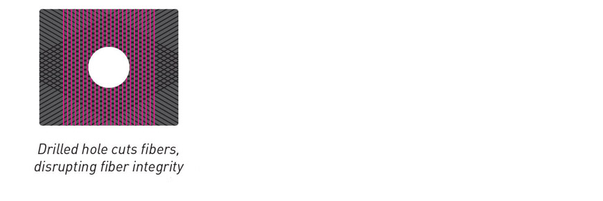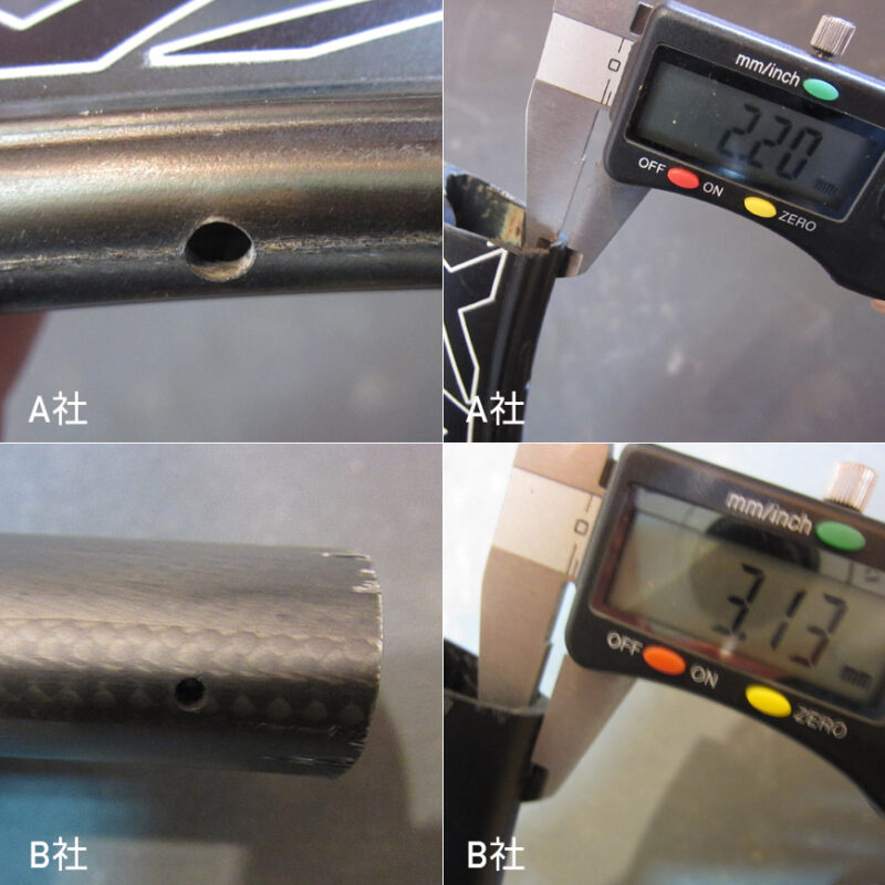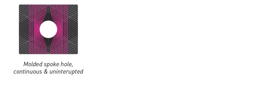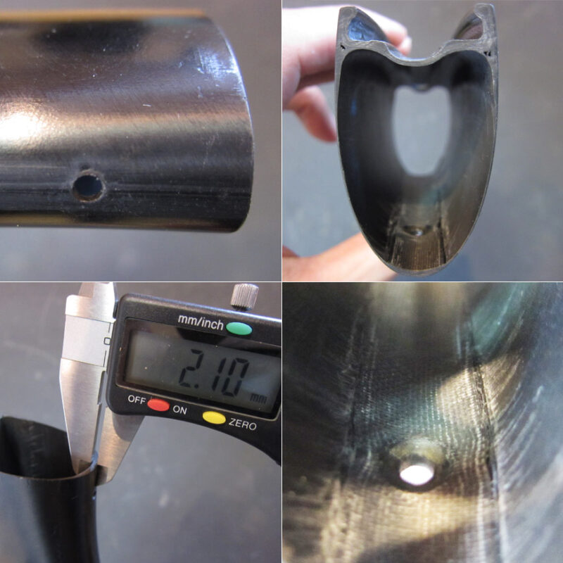 リムの最も剛性保持に大切な場所にカーボン繊維を分断するような穴加工をしない