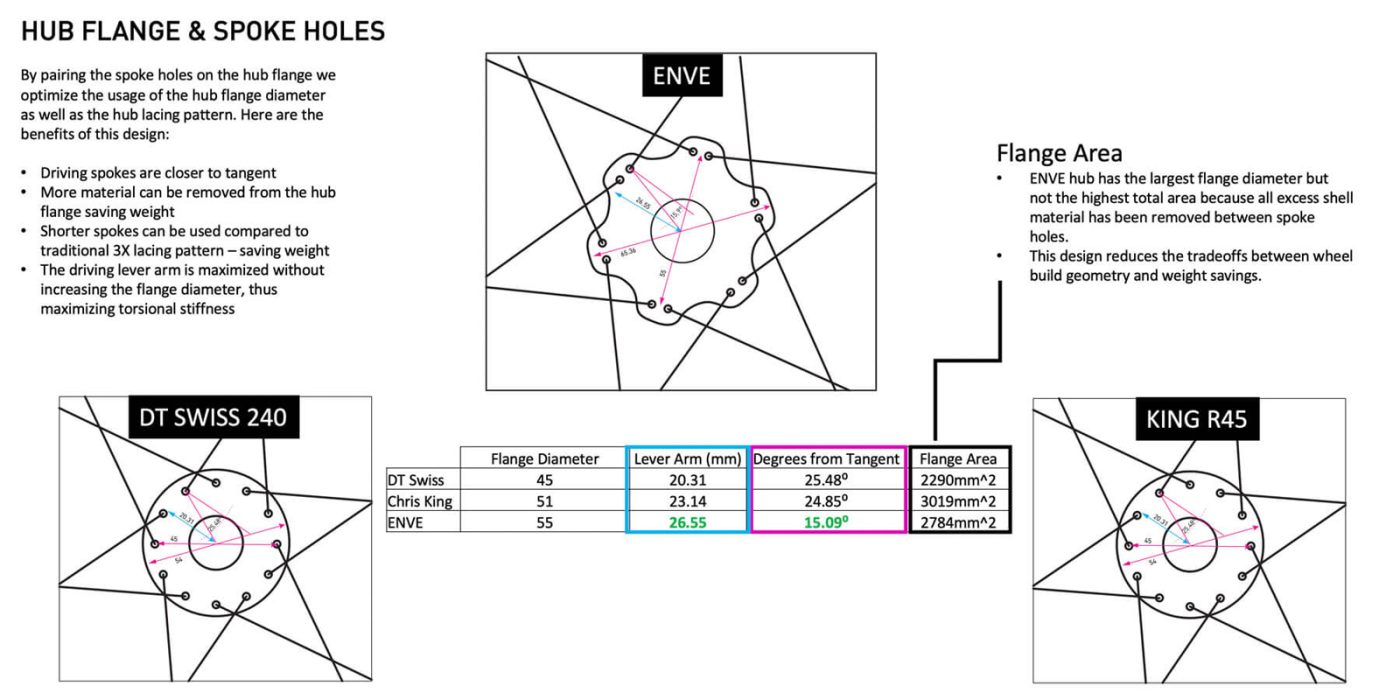 以下の表から、ENVEのハブが利用するスポークパターンが最長で、それゆえハブフランジ上で最も効率的な応力中心距離(スポーク長は最長ではない)を実現していることがわかります。また、同時にフランジ面積をできるだけ小さく抑え、軽量化にも貢献しています。