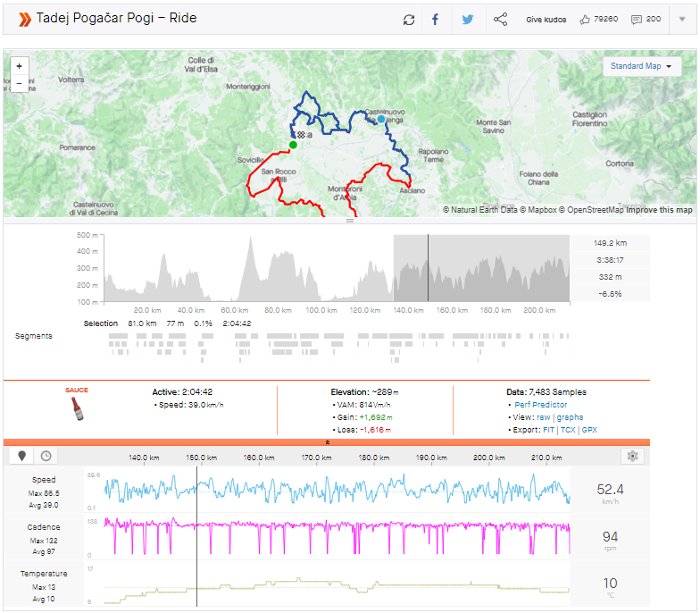 アタック時の5分間の最大パワーは460w/平均340wで荒れたトスカーナの未舗装路や雨が降り滑りやすいダウンヒルをこなし平均38.8km/hのスピードで逃げ続けます。