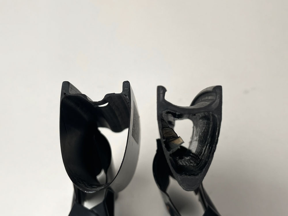 通常カーボンホイールのニップルホールはリムが出来上がった後に、ドリルで穴を開けます。ドリルで穴を開けるとカーボン繊維が途中で切れてしまい強度が下がってしまいます。そして強度を保つために、ニップルホール側を厚くするなどし強度を保ちますが重量が増えホイールバランスも崩れてしまいます。