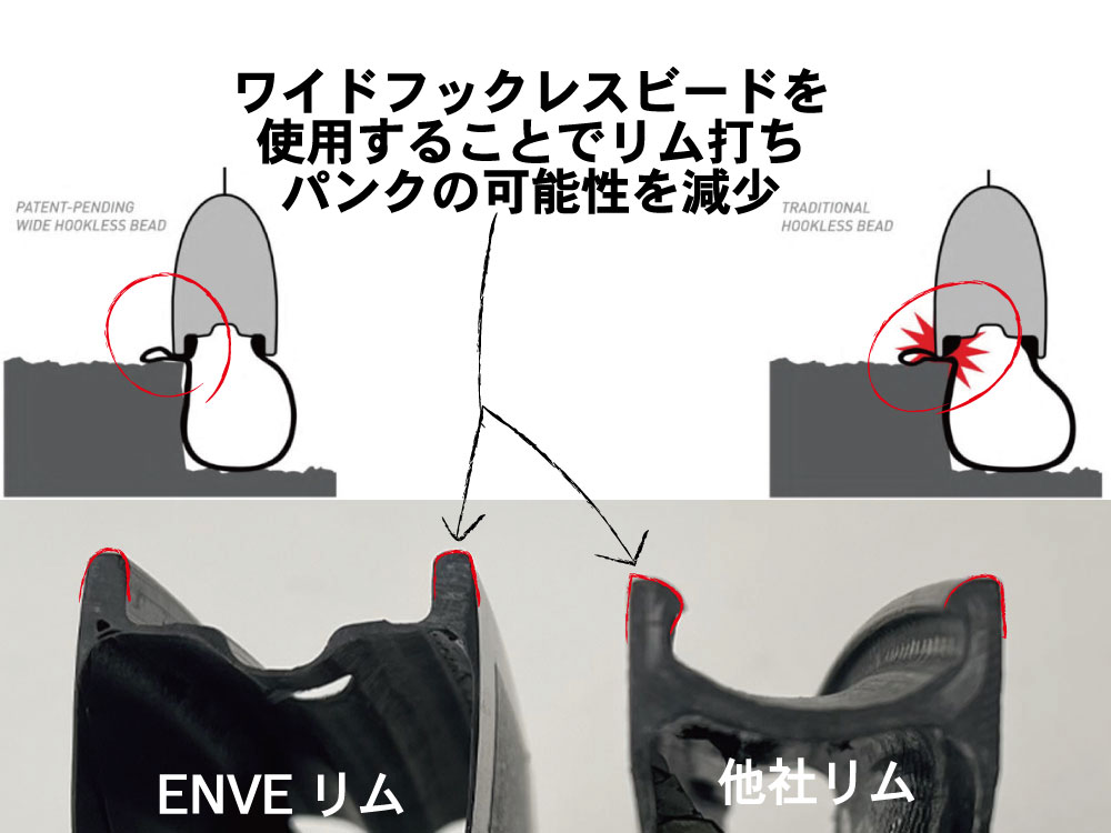 フックレスビードがワイドになることにより、リム打ちパンクのリスクを下げることを達成。