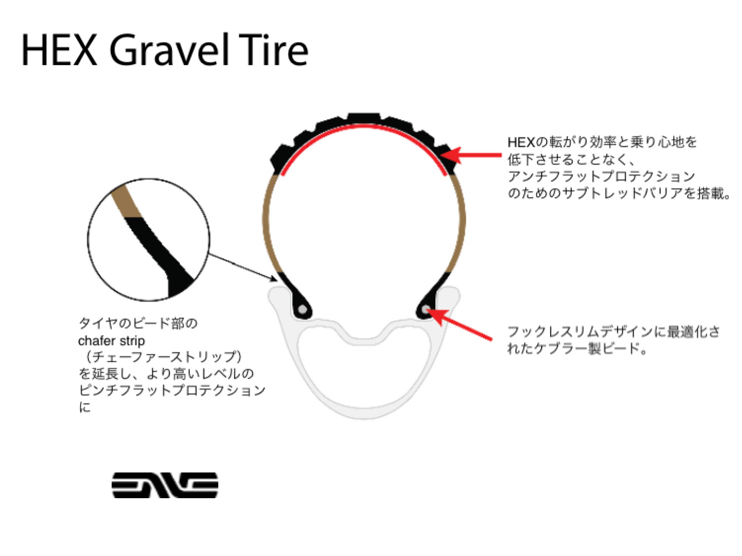 またHEXの特長は、ENVEホイール独自の「ワイドフックレスビード」構造とのマッチングにあります。