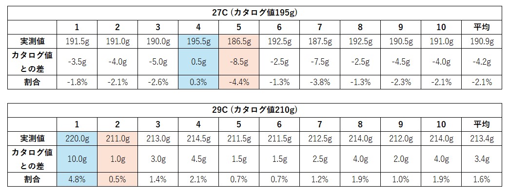 10本だけの平均ですが、カタログ値と比べ27Cは軽めに、29Cは少し重くなっていそうです。