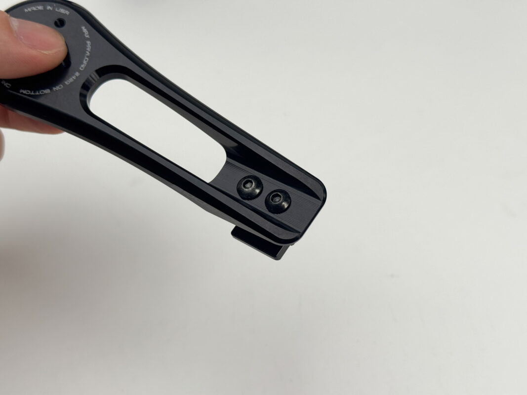 取り付けは、ハンドル裏側に開けられた穴にコンピューターマウントを差し込み、ボルトで固定します。