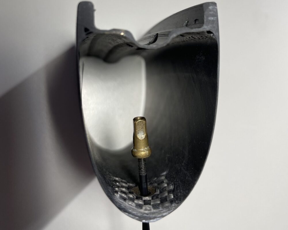 一般的にホイールを作る際に、カーボンが成形され焼かれた後に、ドリルでスポークホールや、バルブホールを作成します。ドリルで穴を開けることにより、カーボン繊維を切断してしまい強度の低下を引き起こしてしまいます。 エンヴィが誇…