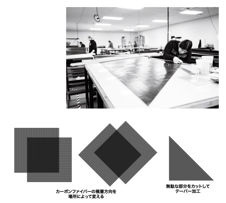 また、ファイバーを特定の方向に重ね、耐衝撃性、剛性、乗り手の操作性といった性能を製品ごとに変えて作成しています。
