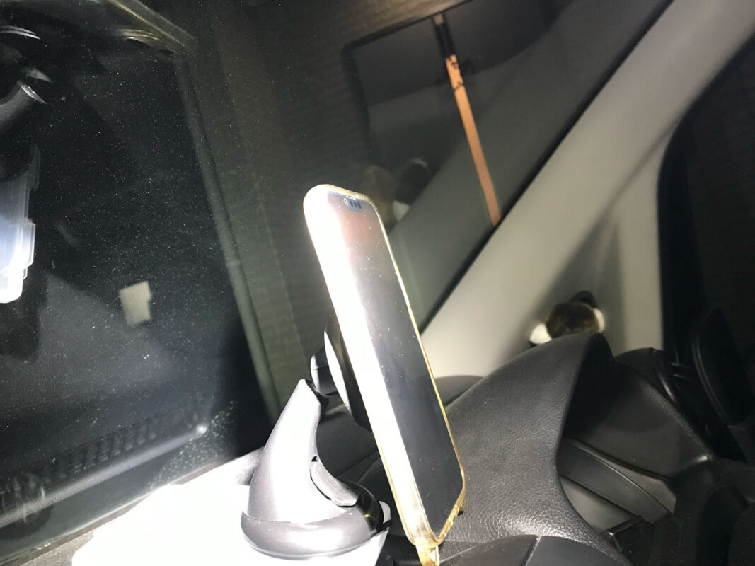 この製品の良いところは、さっとマウントの上に乗せるだけでマグネットと、バキュームの機能でスマホを固定できる点ですね。