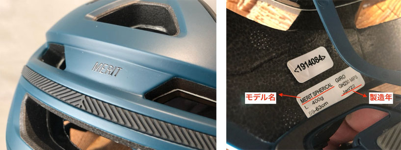 GIRO MERITのモデル名は、ヘルメット外側の背面と内側の側面にモデル名の記載があります。
