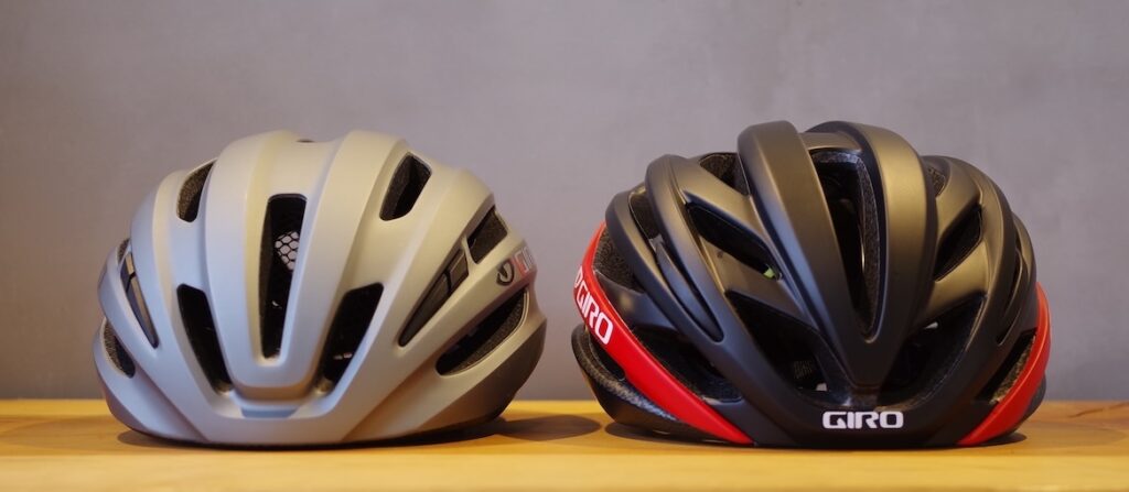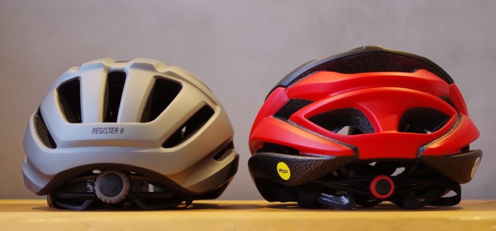 ちなみに、ロードバイクのように前傾姿勢になり顔を前に向く場合、ヘルメットの後ろ側はこのレジスター2や右側シンタックスのようなシェイプになっていないと、首の後ろにヘルメットのダイヤルがかかってしまい、不快感につながる場合があります。