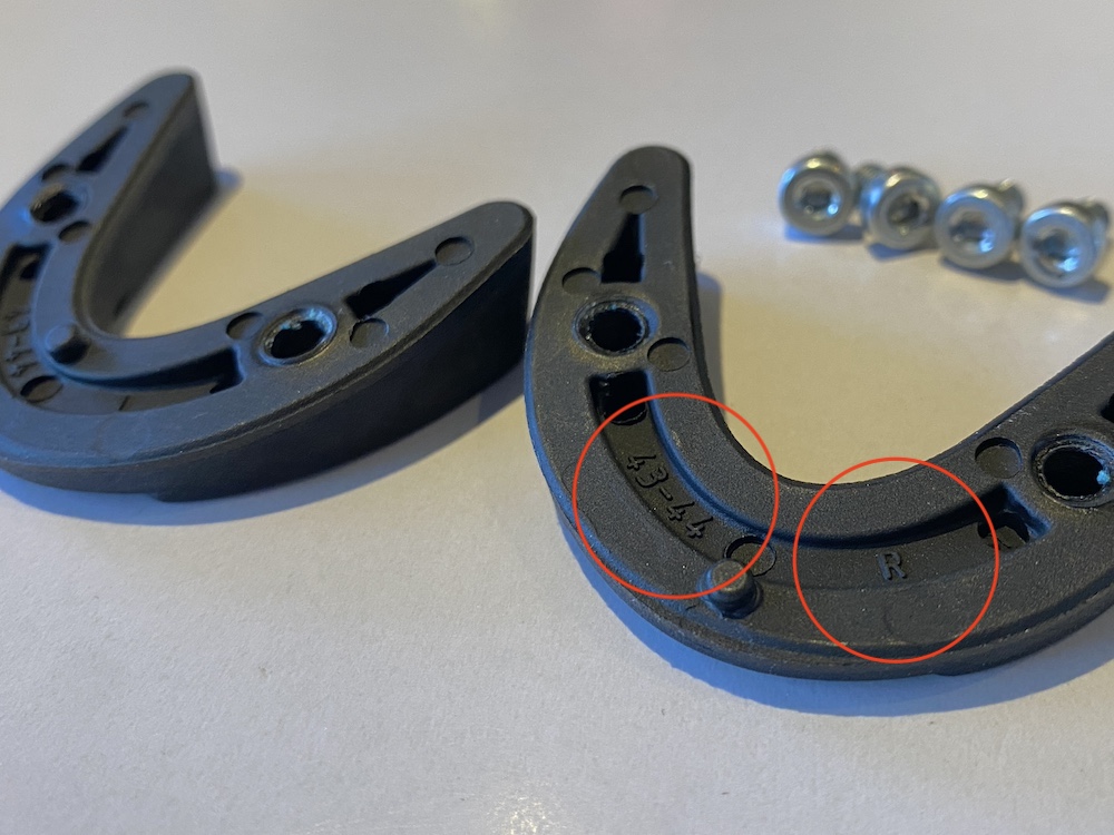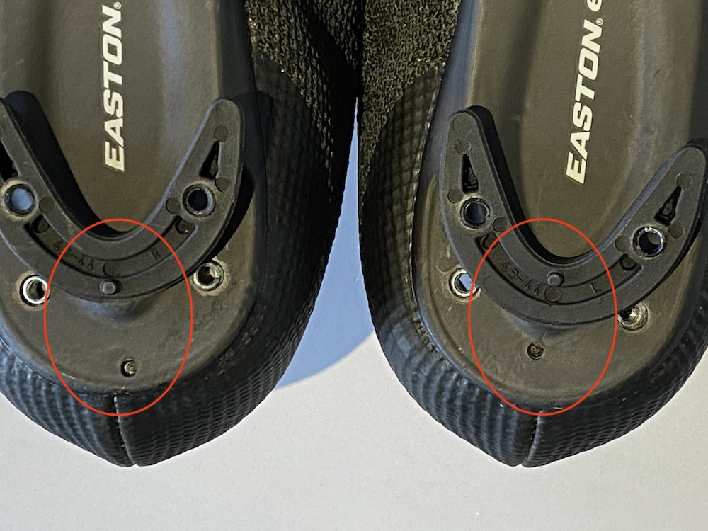 シューズの取り付け部分には小さい穴が空いており、対応するヒールパッドには小さな突起がついています。