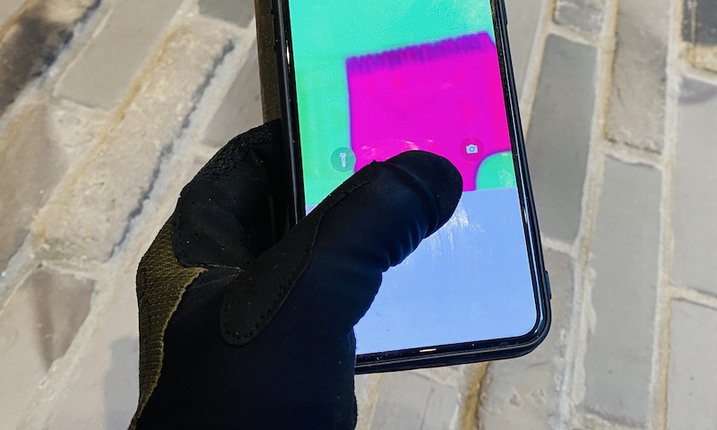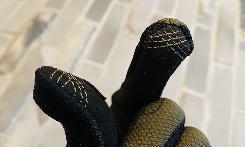 タッチスクリーンに反応する導電性繊維が親指と人差指に設置されています。