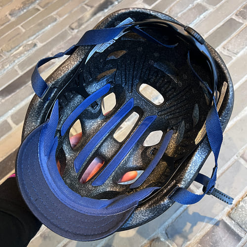 フロントのソフトバイザーを外した上写真、よ〜くご覧いただくとわかるかと思いますが、ダイヤルのついたフィットシステムのライナーが、ヘルメット内側に一周、独立した形で取り付けられています。