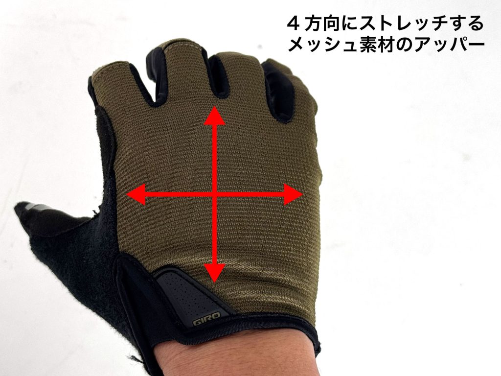 アッパー(手の甲側)には、伸縮性・通気性に優れたメッシュ素材を採用。