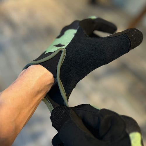 写真左の手のひらをご覧いただくと、親指部分、手のひらと4本指部分、そして適度な厚み(2mm)のクッションパッドを入れた部分、という3枚のパネルで構成され、手のあらゆる動きや、グリップの握りに合わせ考慮されたデザインに。