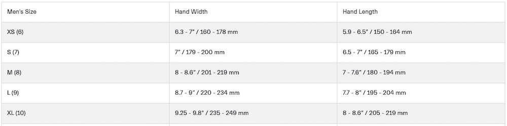 下のサイズ表は、中央が 手囲いサイズ(Hand Width)、右欄は 手の長さ(Hand Length)。