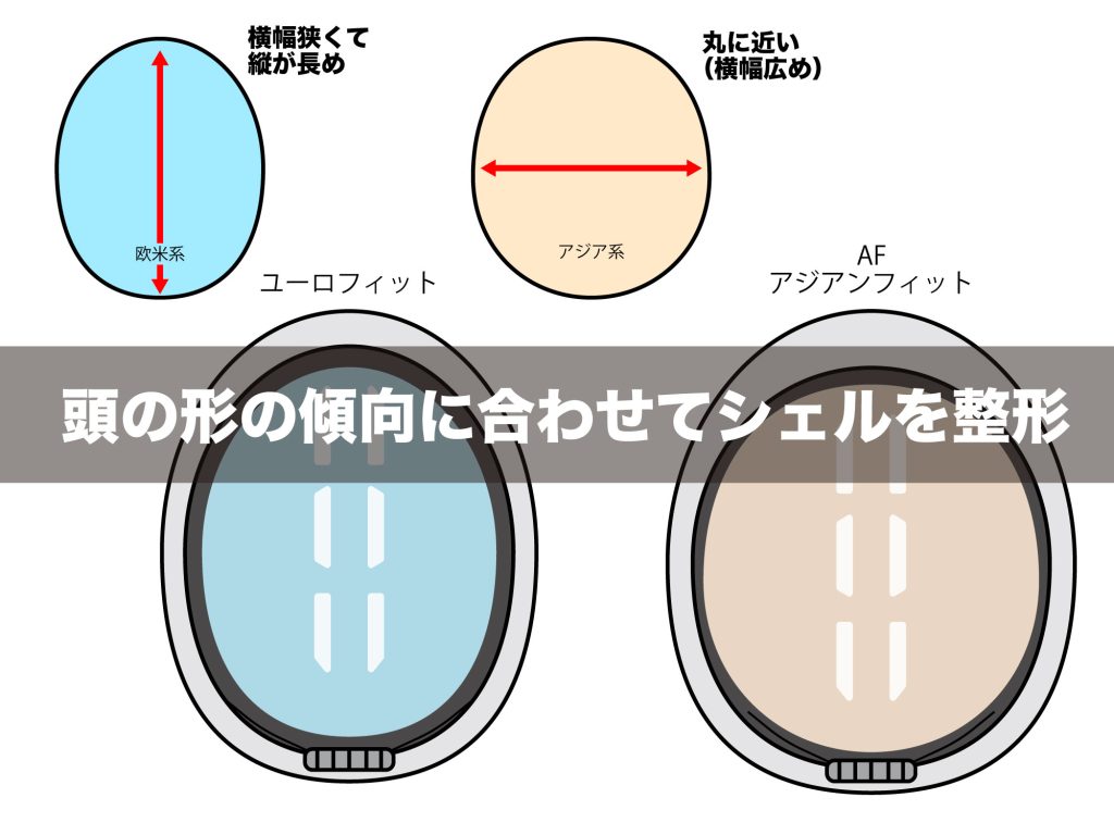 アジア系の方は横幅が広い傾向があるためその頭の形に合うようにヘルメットのシェルを整形しています。