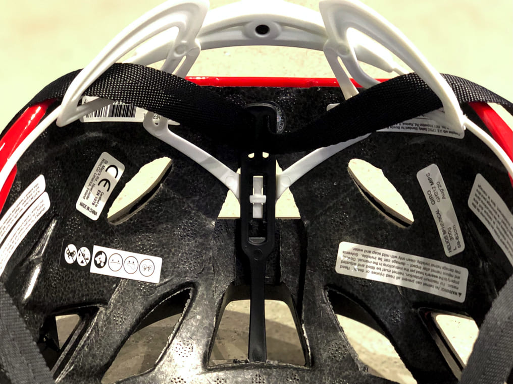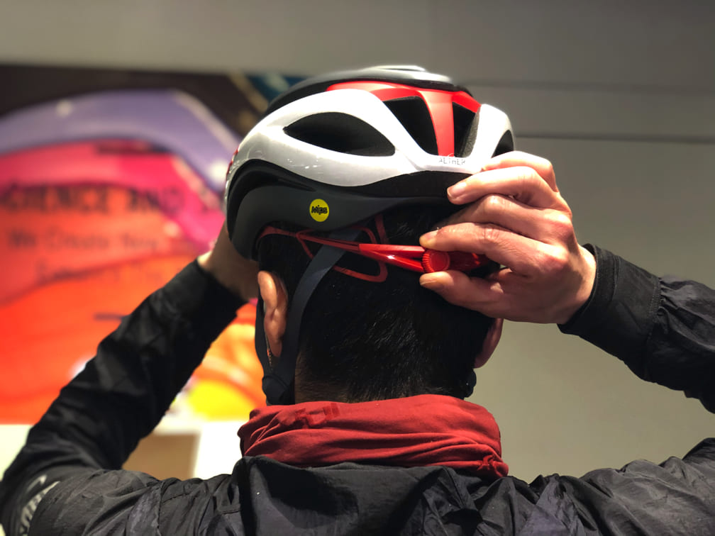 サイドストラップが交差する部分にあるアジャスターを耳のすぐ下に位置するように上下にスライドさせ調整します。こうすることで、ヘルメットの前後左右へのズレや、走行中の風によるストラップのバタつきも抑えられます。