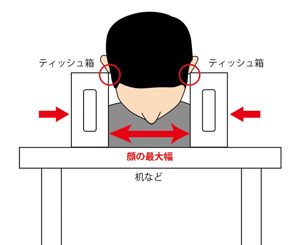一例)平らなテーブルの上にティッシュケースやL字のブックスタンド(硬い素材のもの)を2つ置き、顔をテーブルの面へ向けた状態で左右両サイドから頭部の耳の前側上部(頭部の一番幅が広い部分)に当てる。